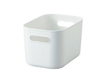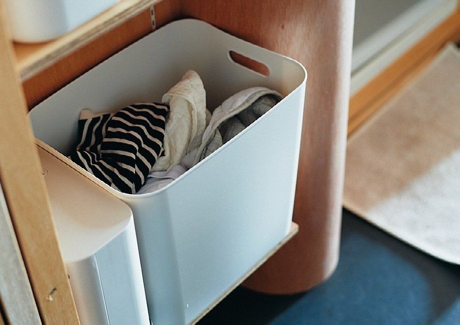 このシリーズは軽くて持ちやすく、別売りのフタがあるから重ねられるのも◎。深さがあるので中身を見せたくないときにもおすすめ。しっかりした素材なので、重い物もしまえます。