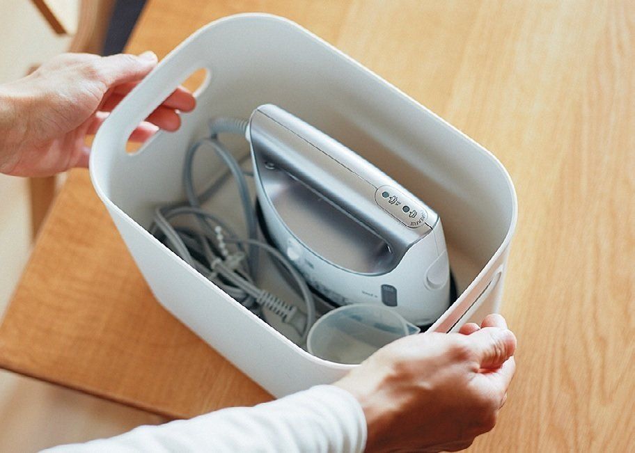 本多家のスチームアイロンは、一般的なアイロンより小さめ。「わが家のアイロンケースにはハーフ・中がピッタリでした」。100均のカゴよりもたわみにくく、持ち運びがラク。水を入れるカップも一緒に収納。