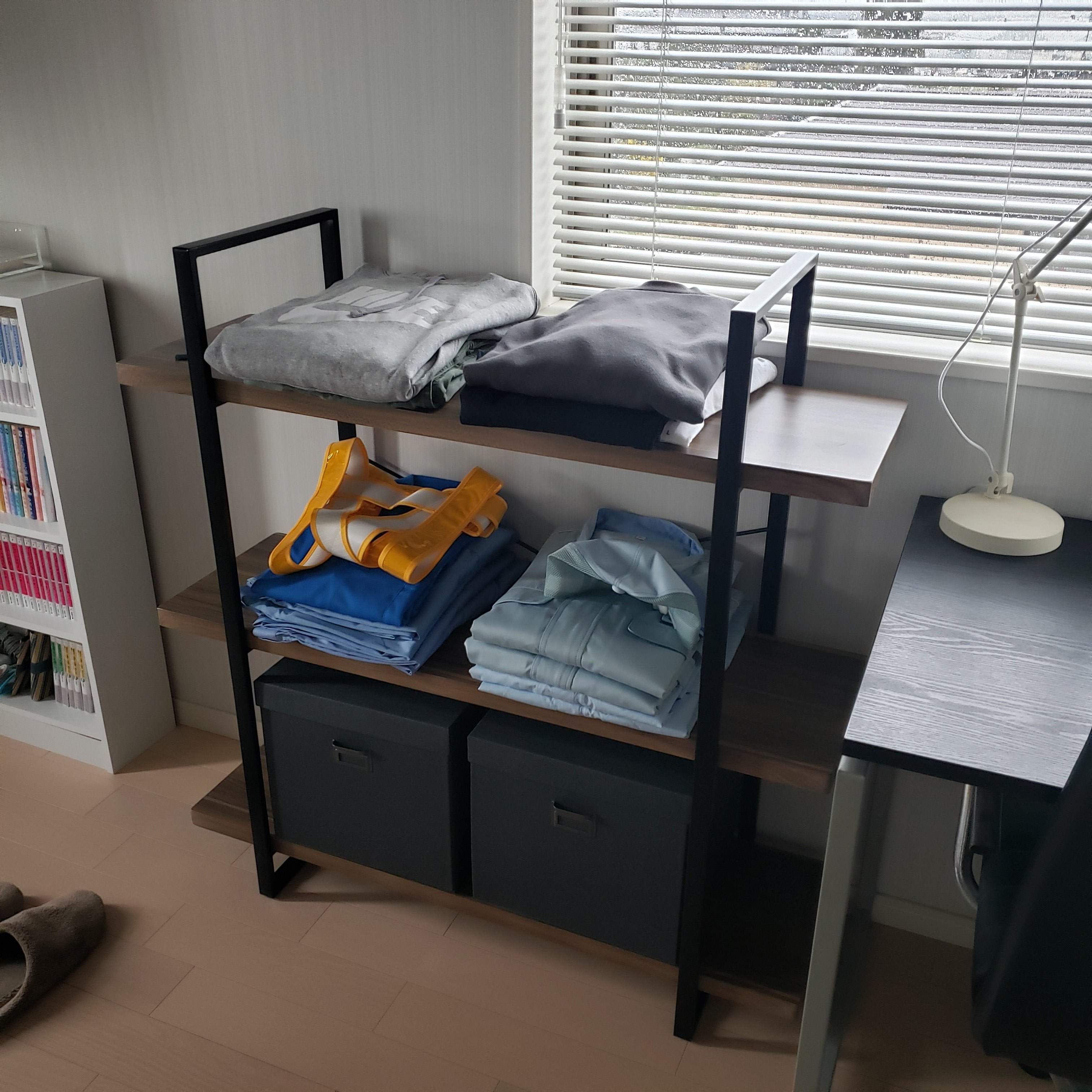 オシャレに興味がないため、最低枚数しか持っていないこともあり、このラックに全て収まっています。オープンなため埃が被りやすいと思い、オフシーズンの服はボックスにしまうことに。出しっぱなしの収納でも見た目が多少スッキリしました。