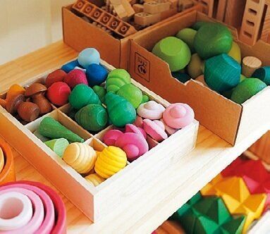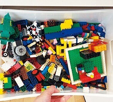 ブロックは種類や色で分類せずまとめてしまう方が、子どもも片づけやすい♪高さ約10cmの浅い箱はブロックを探しやすいので◎。