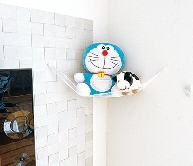 100円グッズの浴室用ハンモック収納を活用して、よく遊ぶぬいぐるみの特等席に。ほかの物は1人1BOXでざっくり収納。