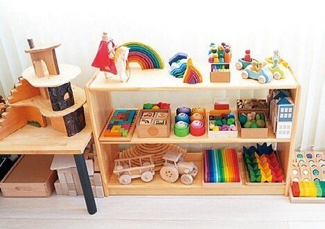 毎日遊ぶ人形は子どもが立ったときにすぐ手が届くゴールデンゾーンに。軽い物は上、重い物は下に置くのも片づけのコツ。
