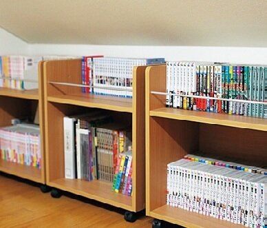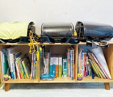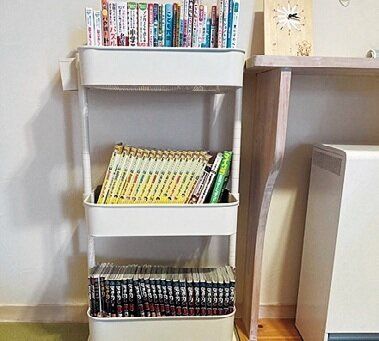 よく読む漫画や絵本はワゴンが定位置。手に取りやすくてすぐ戻せます。学校で借りた本はランドセルを置く棚にしまいます。