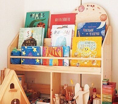 本のお顔が見えるようにポンと戻せばOK。並んだ本の隙間に戻す本をねじ込まなくていいので、まだ力が弱い園児に最適。