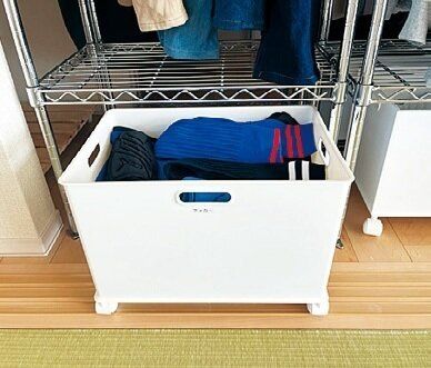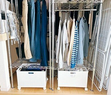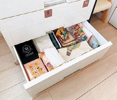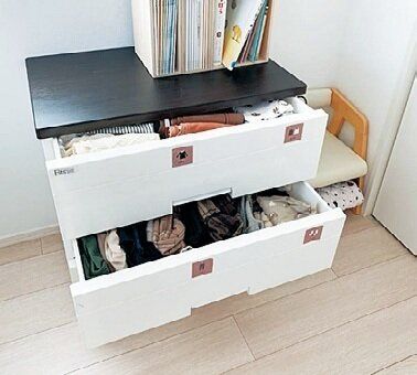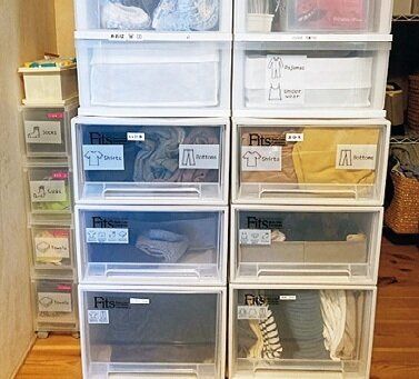 毎日着る服やパジャマは衣装ケースの1~2段目にひとまとめ。朝の身支度も入浴後のお着替えもここで完結するのでラクです。