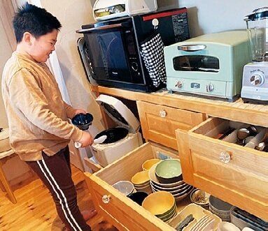 子どもの身長に合わせてお茶碗や取り皿などを配置。子どもの手が届きやすく、「準備して」のひと言で配膳してくれます!