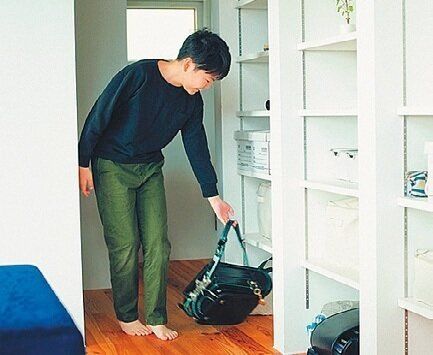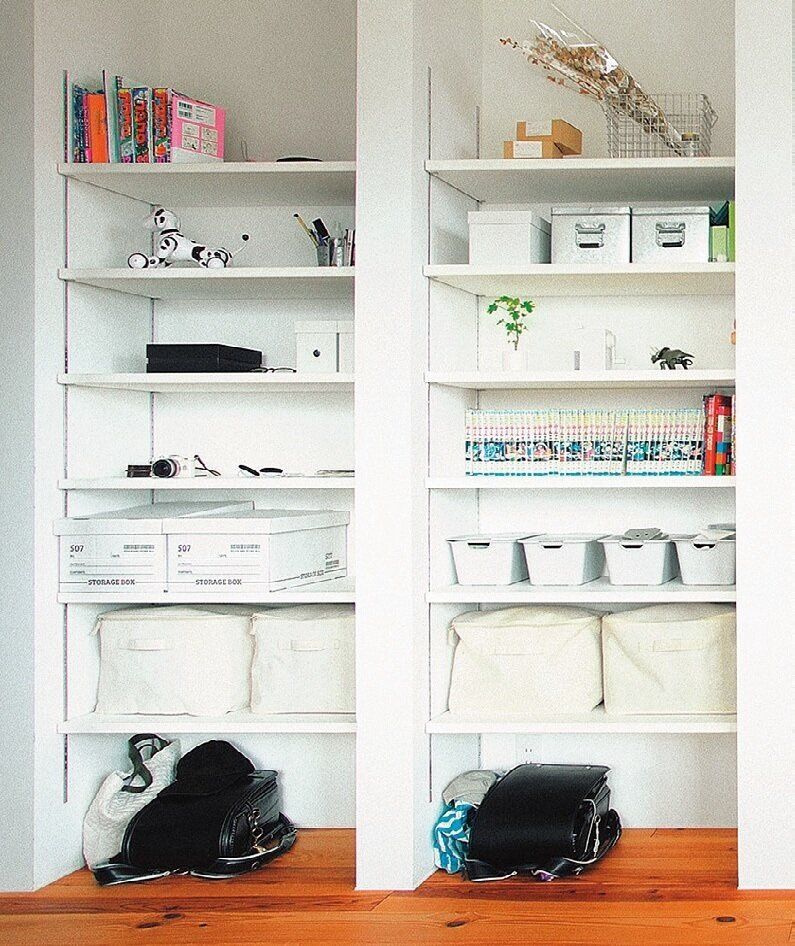 「子どもは棚の上にランドセルを置いてくれないので、いちばん下は棚をつけず、放り込むだけにしました」。上下がひっくり返っていてもここに収まっているだけでもスッキリ!