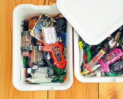 「おもちゃ入れは小さいボックスにして、中はグチャグチャでもOKとしたら、自分で片づけてくれるように」。ふたが閉まらなくなったら、量を見直すサインとして使っていない物は処分。