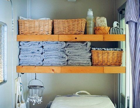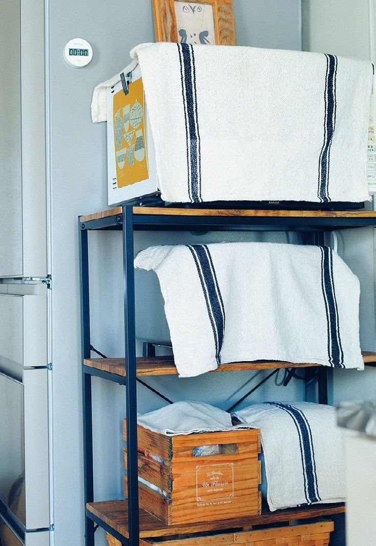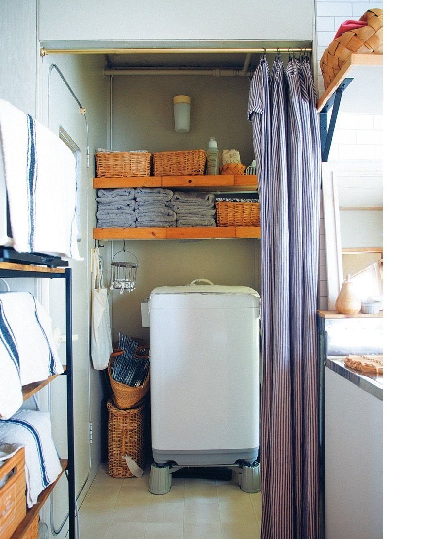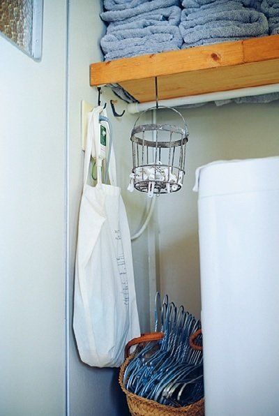 洗濯機の上の空きスペースを使わない手はない!風通しのいい収納スペースを確保し、気候が暖かくなっても湿気対策は万全。タオルはワンアクションで取り出せ、洗剤も切れたらカゴのストックから即補充完了。