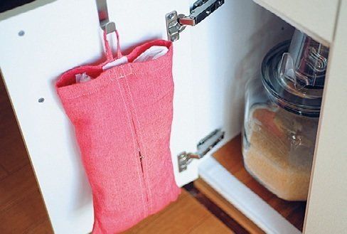 シンク下に100均のティッシュカバーをつり下げ、レジ袋をIN。1枚ずつ取り出せて便利。