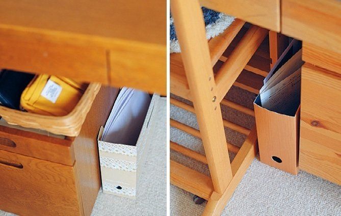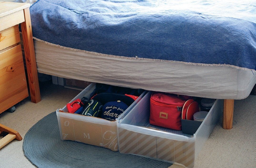 収納が少ないからといって奥にしまい込むと探すのが大変に。そこで、壁面や家具の下などデッドスペースを有効活用。逆に出し入れがしやすくなってイライラも解消。