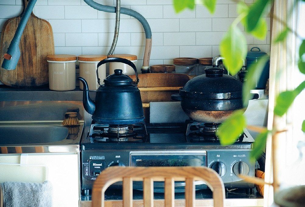 まな板、ご飯炊き用の土鍋、砂糖や塩はガス台から最短距離に出したまま。調理がラクなのはもちろん、素材や色みをそろえることで見た目も落ち着く。「お気に入りの物に囲まれているから、毎日の料理が楽しい」。