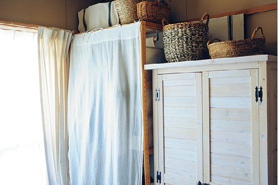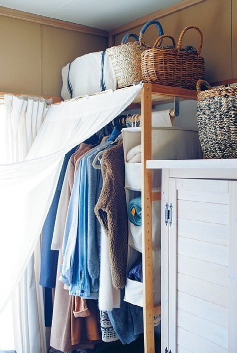 服は生成りの布で隠してスッキリと。窓のカーテンと色みをそろえれば部屋が広く見える効果も。