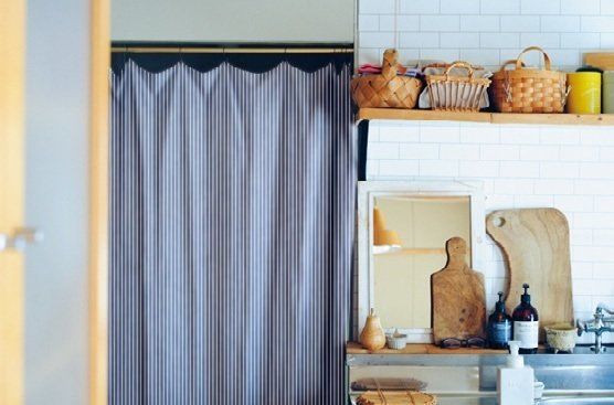 脱衣所はブルー系でさわやか、かつ透けないよう厚めの布に。ふだんはオープンにすれば圧迫感ゼロ。