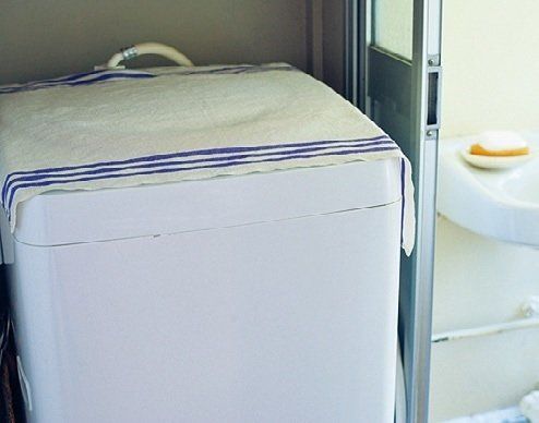 文字やピンクのパーツが目立つ洗濯機は布ですっぽりカバー。ふたさえ隠せばだいぶ存在感が薄くなる。