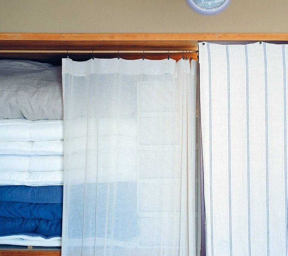 押し入れのふすまは取っ払って、透け感のある布にチェンジ。ふとんカバーも大好きなリネンに。