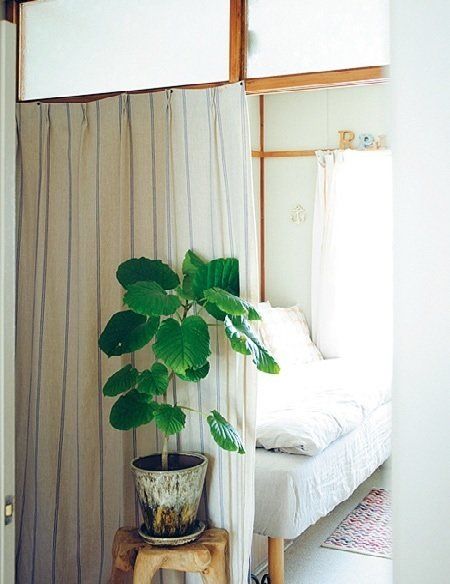 ストライプの布でふすまをカバー。+グリーンで和室がおしゃれなナチュラルインテリアに。