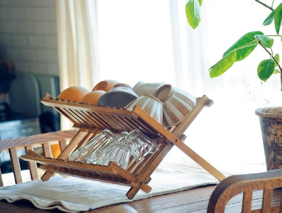 食卓に水きりラックを置き、茶碗やお椀の定位置に。すぐ手に取れるから自分でよそうのが習慣に。