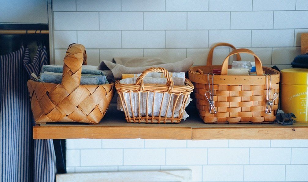 - 趣味で集めたカゴが大活躍。バラバラなのがかえってかわいい