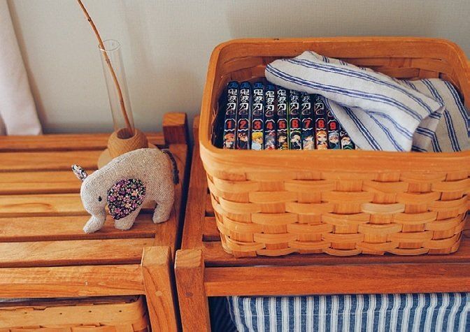 娘の部屋のカゴには家族全員夢中の『鬼滅の刃』。カゴごと全巻リビングに持ち運べてラク。