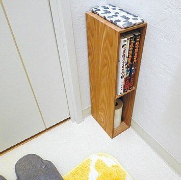 「部屋の隅っこに置きやすい絶妙なサイズ、チープじゃない木目、シンプルな形がいいんです」(大沢さん)。本来はスリッパラックですが、リモコンを入れるラックにもぴったり。