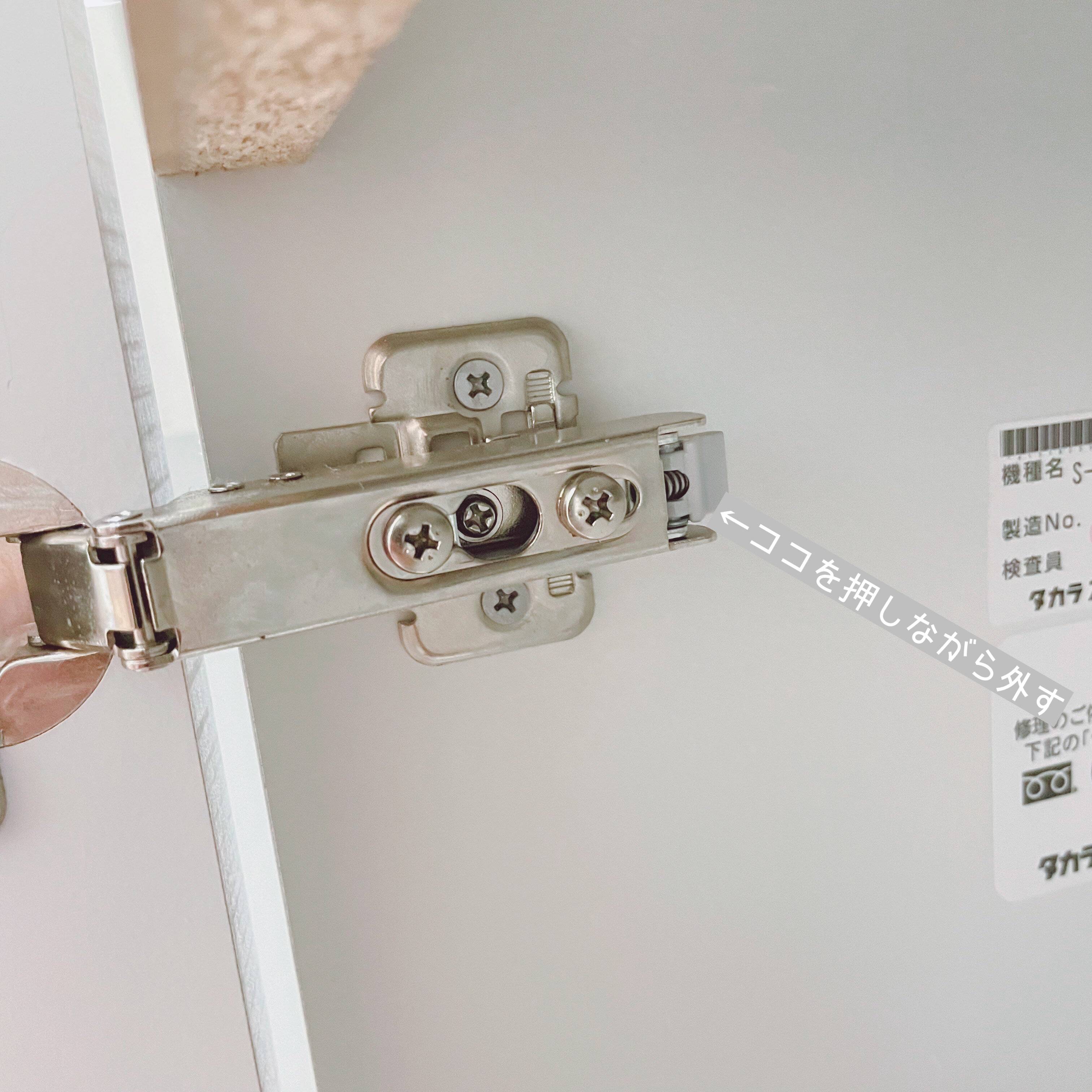 丁番の奥にある着脱レバーを押すだけで、扉はカンタンに取り外せます。詳しい脱着方法は、洗面化粧台のメーカーの公式取扱説明書にも記載されています。
