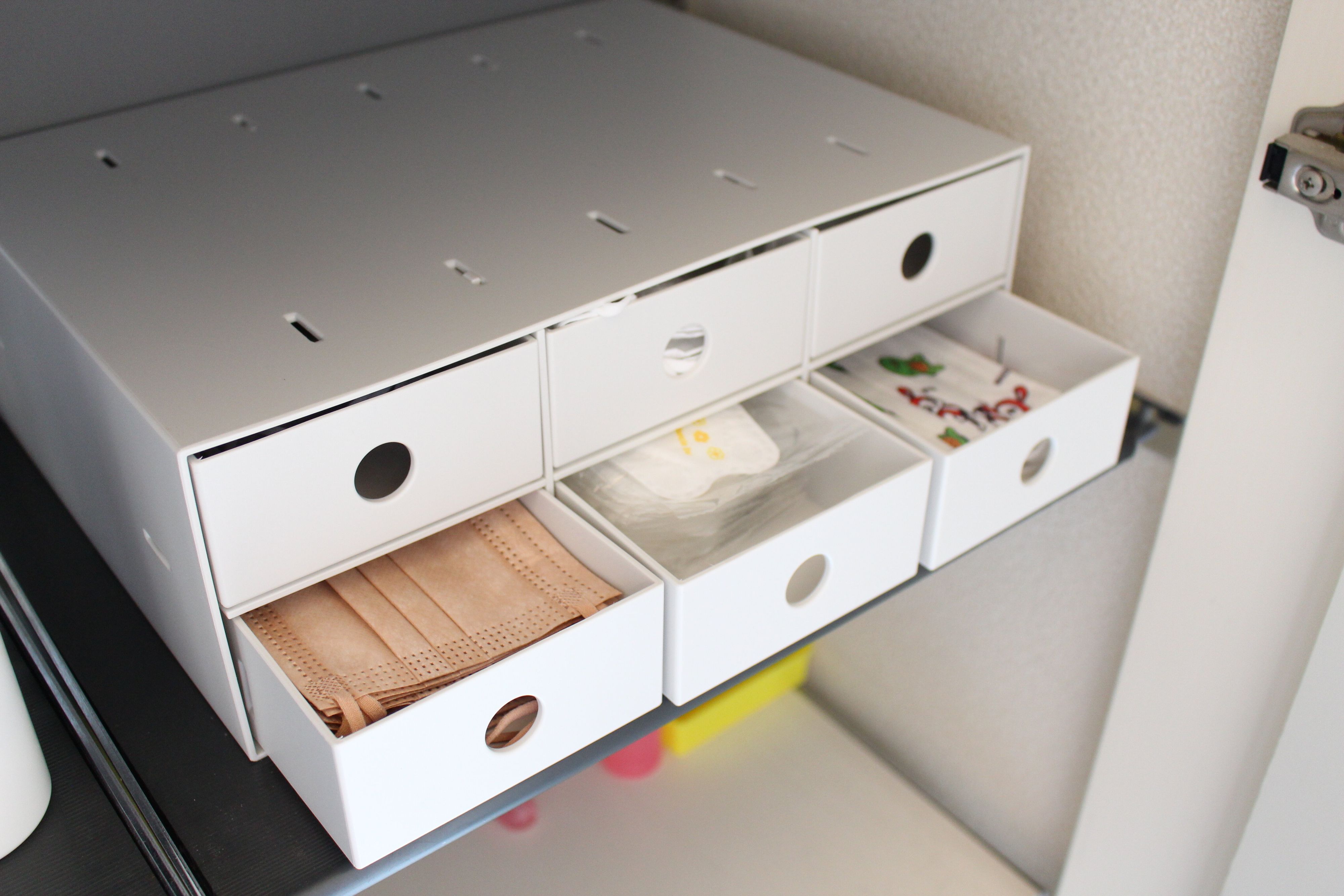 外出時にさっと取り出せるよう、この引き出しは玄関の下駄箱内に置いてあります。「マスク忘れたー!」と、部屋の中に戻る事のないようこの位置がベスト。
