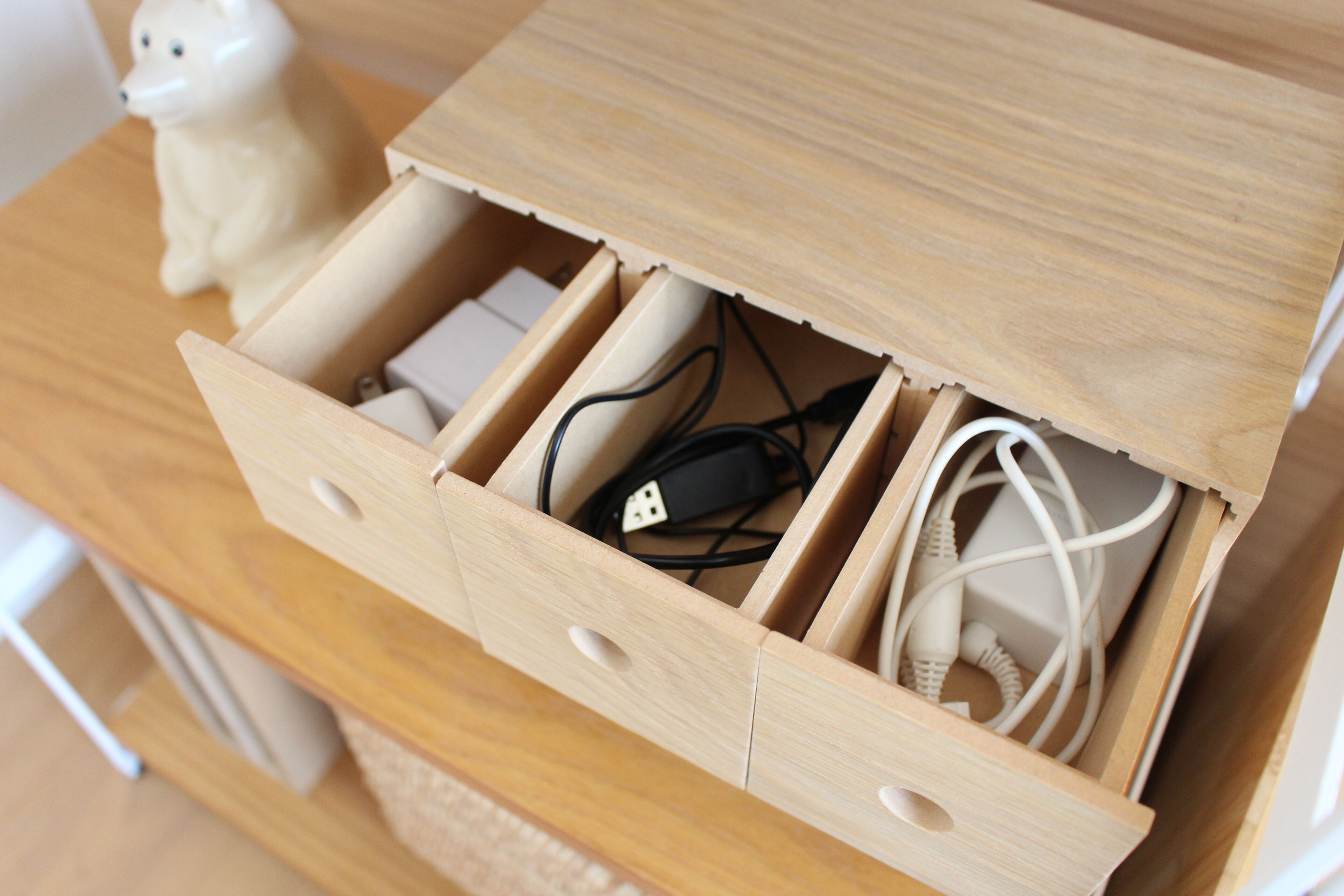 全て一緒にまとめて収納すると、いざ使いたい!と思った時にとても分かりにくかった事から、ケーブルや充電器もそれぞれ引き出しに分けて収納しました。