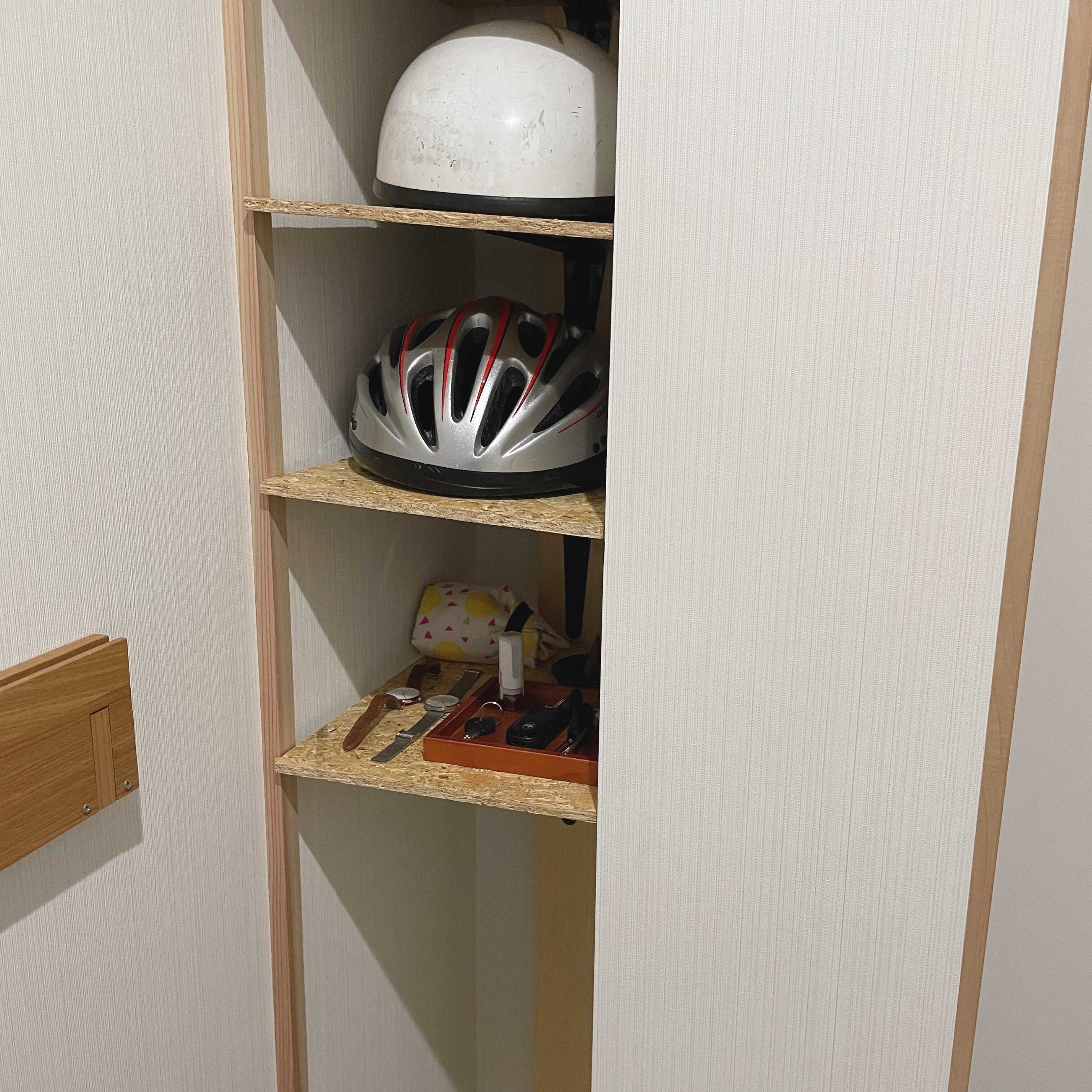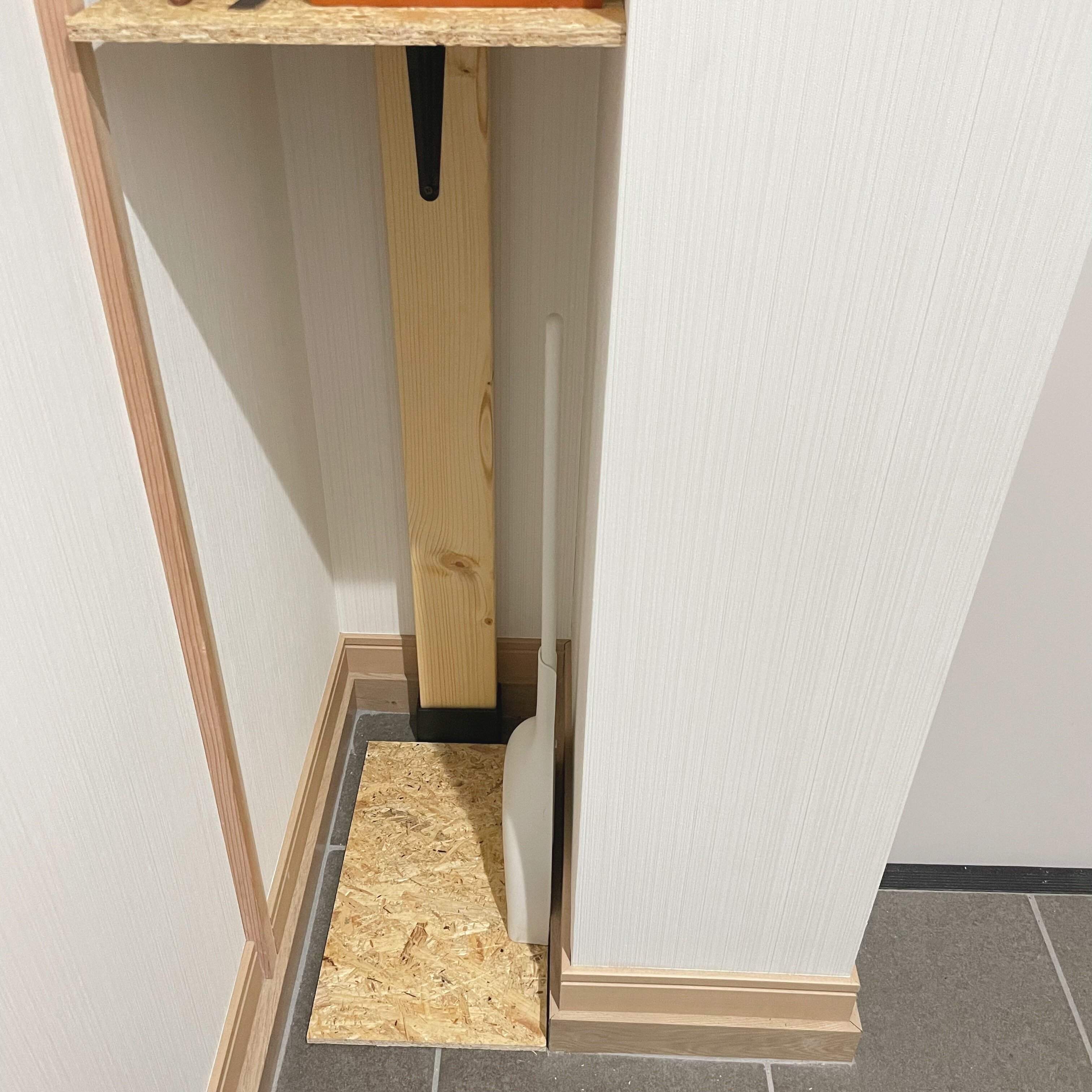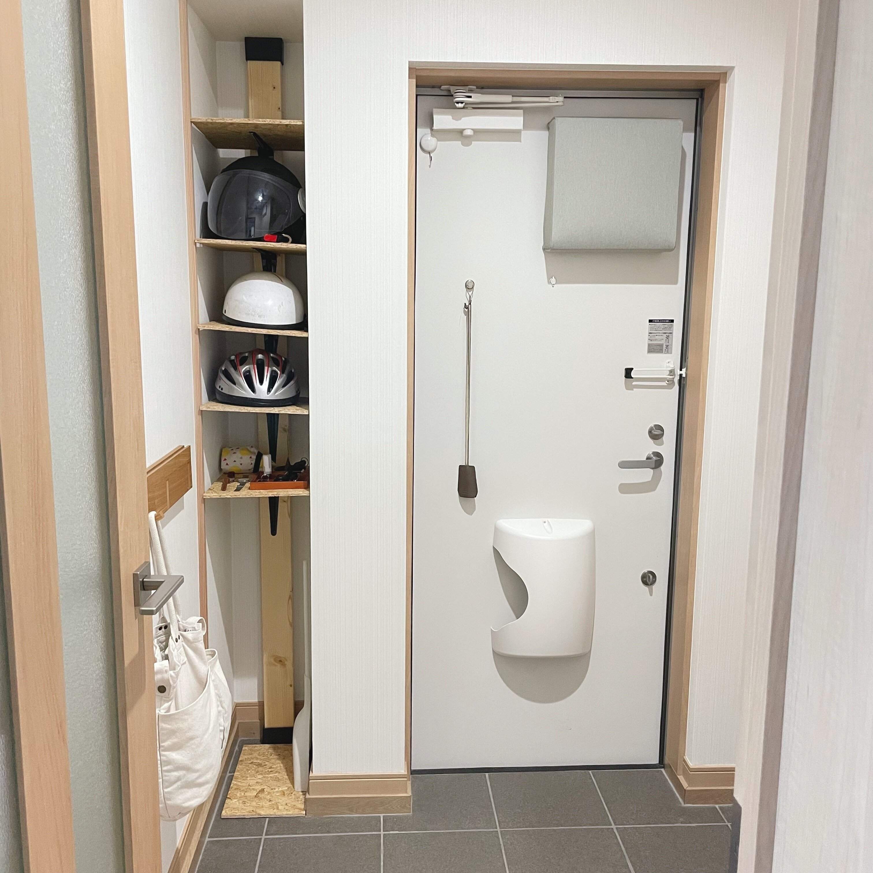 靴以外にも、玄関に収納していた方が動線がよいものもいくつかあります。そこで、デッドスペースに自作の棚をつくったり、壁面を利用したりして、収納量をアップしてみました。