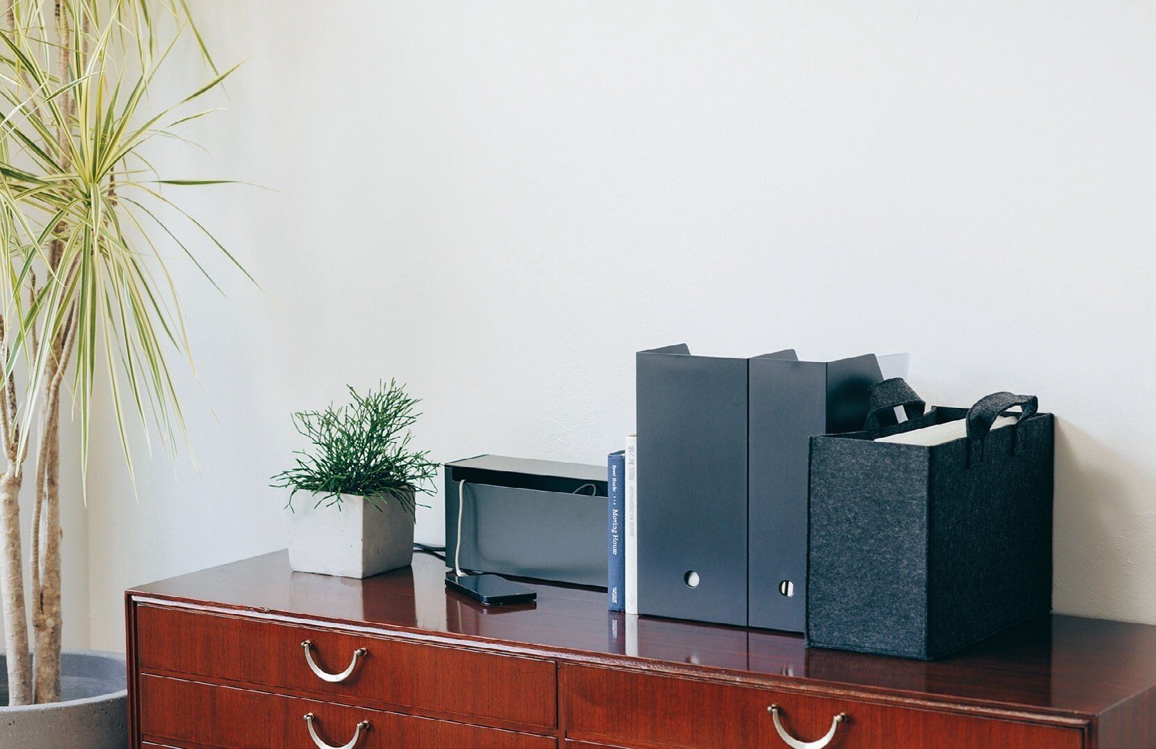 再生素材を使用したファイルボックスなど、ダークグレーのアイテムは、部屋の雰囲気に合わせて選べるのが好評。軽くて持ち運びしやすいフェルト素材も人気が高まっています。