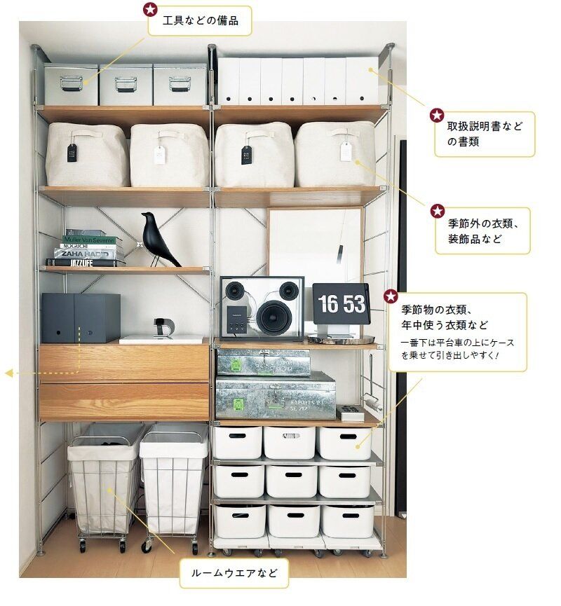 使用頻度が低い物は上に、よく使う物は下段に。中段に置いた雑貨は、黒を多めに取り入れています。2段目のソフトボックスには黒と白のタグをつけて、中身がすぐわかるように。