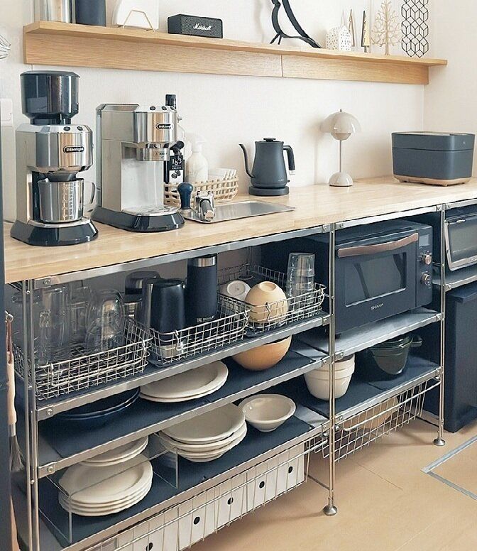無印良品のステンレスラックの上に木の天板をのせてカウンターに。一番下の引き出しバスケットには、ハーフサイズのファイルボックスを入れ、調味料類をストック。