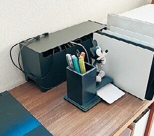 ★ダークグレーのファイルボックスに、化粧水やフレグランスのストック、電子機器の小物などを。中のごちゃつきを隠せ、出し入れしやすいのが便利。