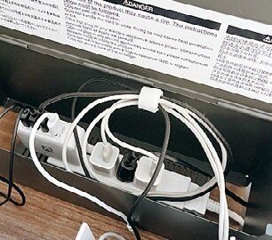 電源タップの裏にマグネットをつけ、スチールボックスの中に。長いケーブルは結束テープで巻き、フタに貼りつけています。