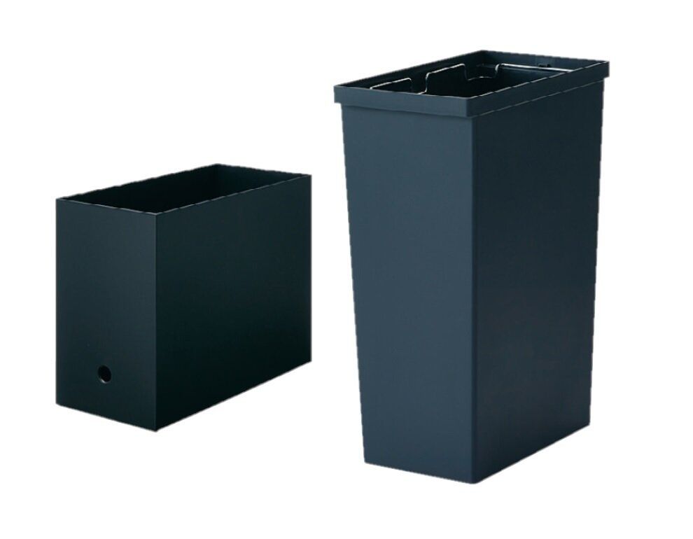 (右)再生ポリプロピレン入りフタが選べるダストボックス 大¥1,790、(左)ポリプロピレンファイルボックス・スタンダードタイプ・ワイド・A4用ダークグレー¥790
