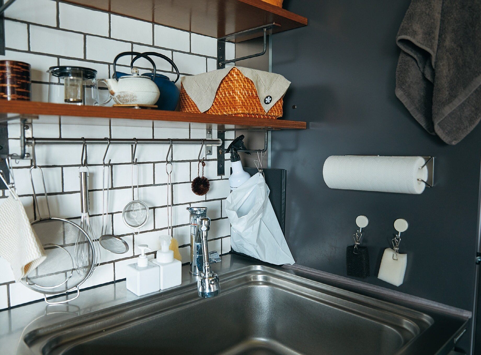 水回りはシンクに合わせて、ステンレス素材の物をチョイス。無印良品の手付きザルをはじめ、キッチンペーパーやスポンジも浮かせて収納すれば、狭いスペースを有効活用できるし衛生的!