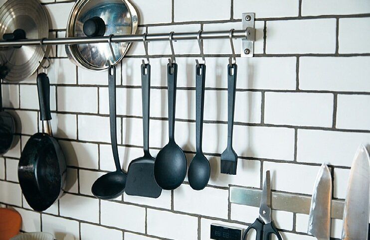 調理中にさっと取れるコンロ上に、調理用具を掛けて収納。シリコーン調理スプーンなど、黒の無印良品で揃えれば統一感あり!