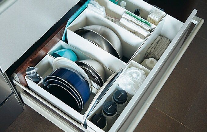 ボウルなどは、ファイルボックスに立てて収納。家事効率がアップ!