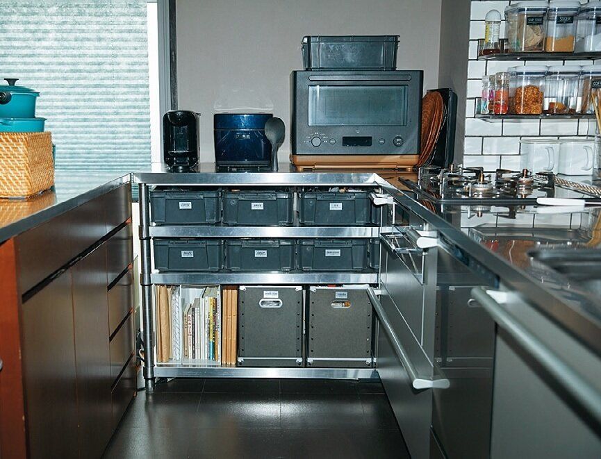 並べるだけで絵になる黒収納には、乾物類やスパイス、お茶などをストック。「浅めなので引き出して使えて、在庫確認しやすい点も◎」。