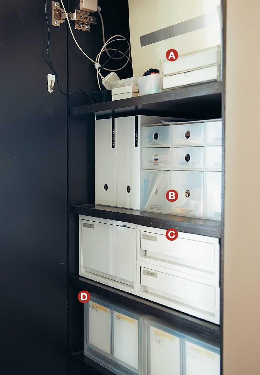 大切な領収書などの紙アイテムは、引出式収納に。A4サイズも入り、重ねて使えます。