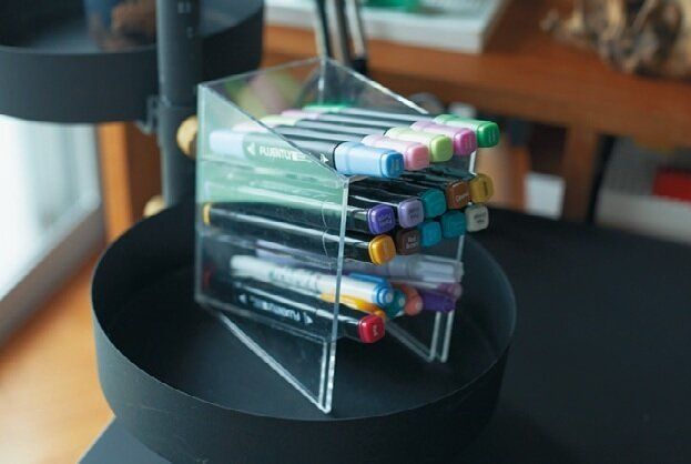子ども用のペンは、3段のスタンドに並べて収納。ペン立てより取り出しやすい!