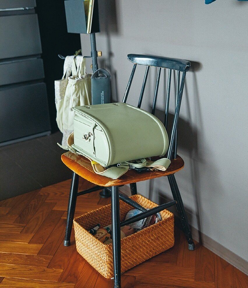 玄関付近に置かれたいすが、ランドセル置き場。その下に中身が見えないラタンバスケットを置き、ハンカチなどのお仕度グッズ入れに。