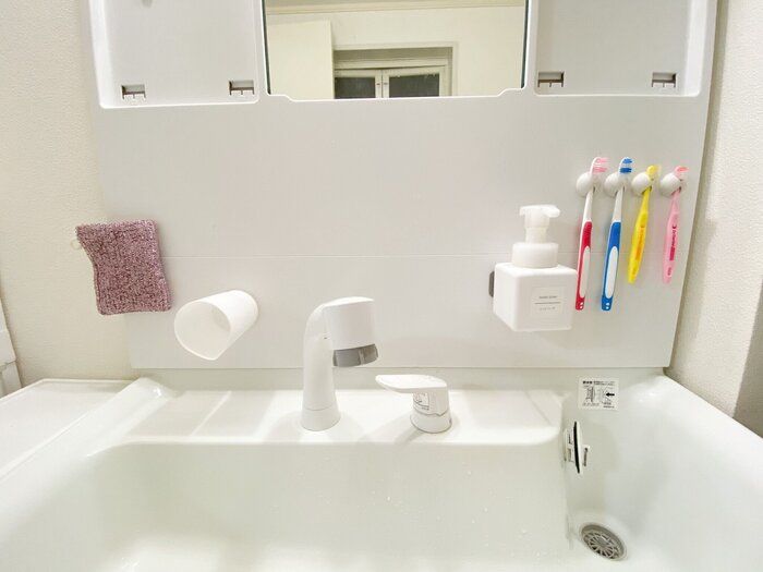 SHIROさん宅では、100均で購入したコードクリップやマグネットパネルを洗面台に取りつけ、歯ブラシやハンドソープ、掃除用のスポンジなどを浮かせて収納しているといいます。こうすることで、いちいちものを動かして水あかやほこりを掃除しなくても、キレイな状態を保てるのだそうです。