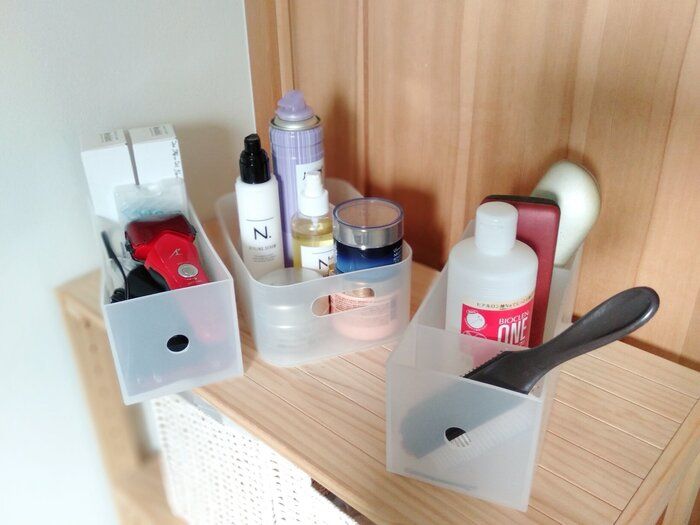 子どもが3人いて、毎朝洗面所を使うのに戦争になる中島愛さん宅。洗面所下の棚に夫用、子どもと自分用、家族全員用にわけたケースを置き、そこに身じたくに使うアイテムを収納しているそうです。入っているものが見やすく、倒れづらくて出し入れもしやすいので、いそがしい朝の時間短縮になっているそうですよ。