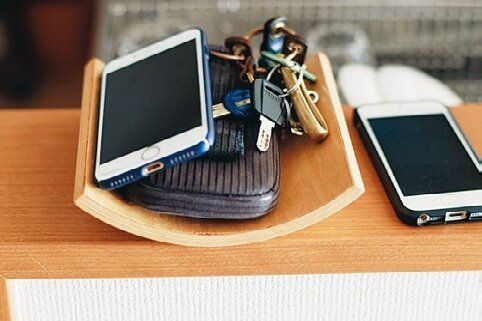 夫が通勤時に携帯する物はキッチンカウンターの上を収納場所に。帰宅したらリビングに直行するので通り道のこの場所が便利。