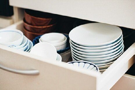 家族6人分の食事を作るとなると、食器や食料品のストックも大量に。限られた収納でもうまく収める工夫でキッチンがゴチャつきません。