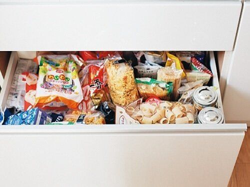 「子どもが4人いるので食品ストックは多めです」。引き出しを閉めれば中は見えないので、ドサッと入れてもOK。