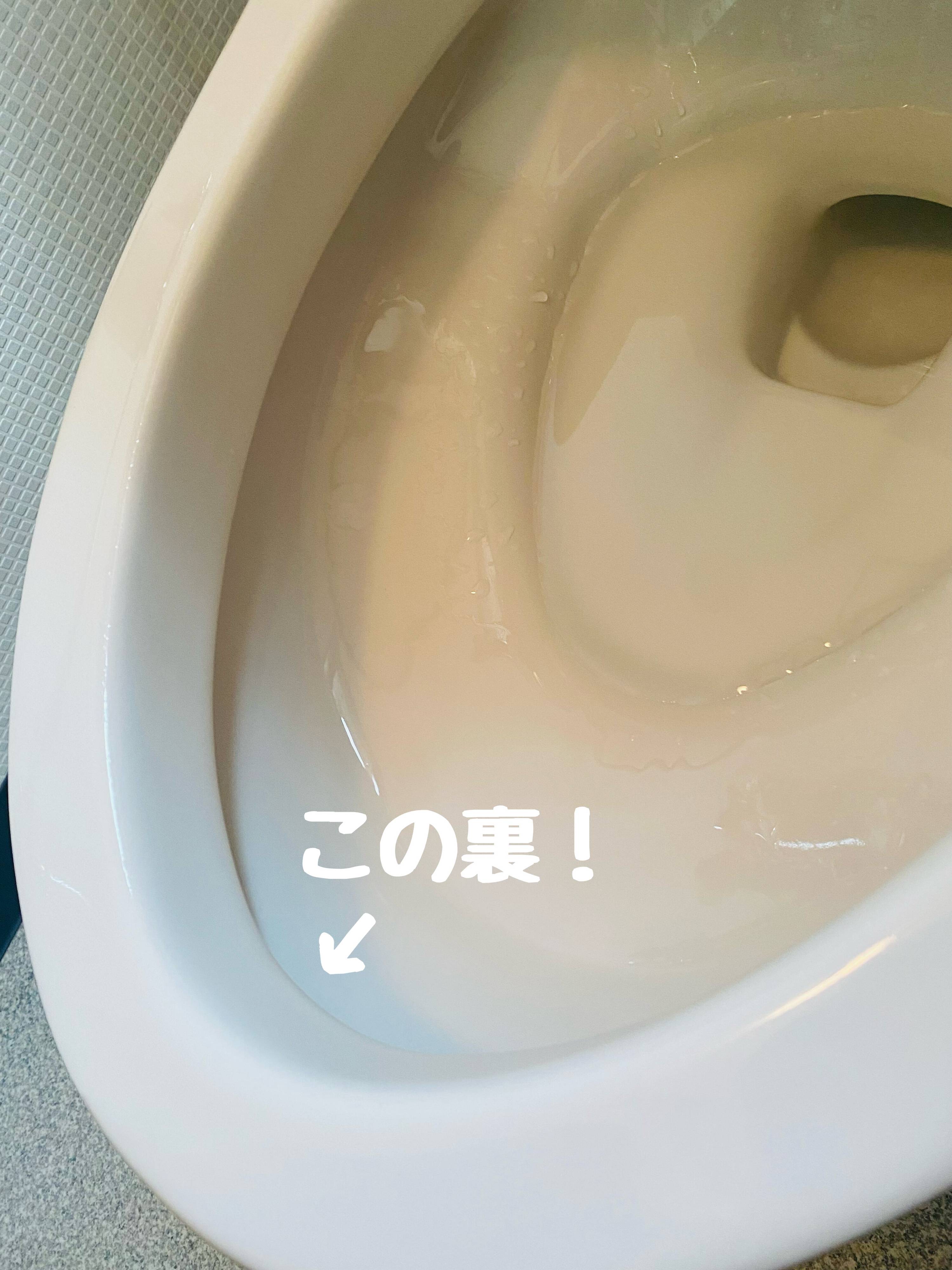 日々の掃除では見逃してしまうのが、便器のふち裏。ここは便器を真下から覗かないと見えない場所で、なおかつ尿石が付きやすい場所です。