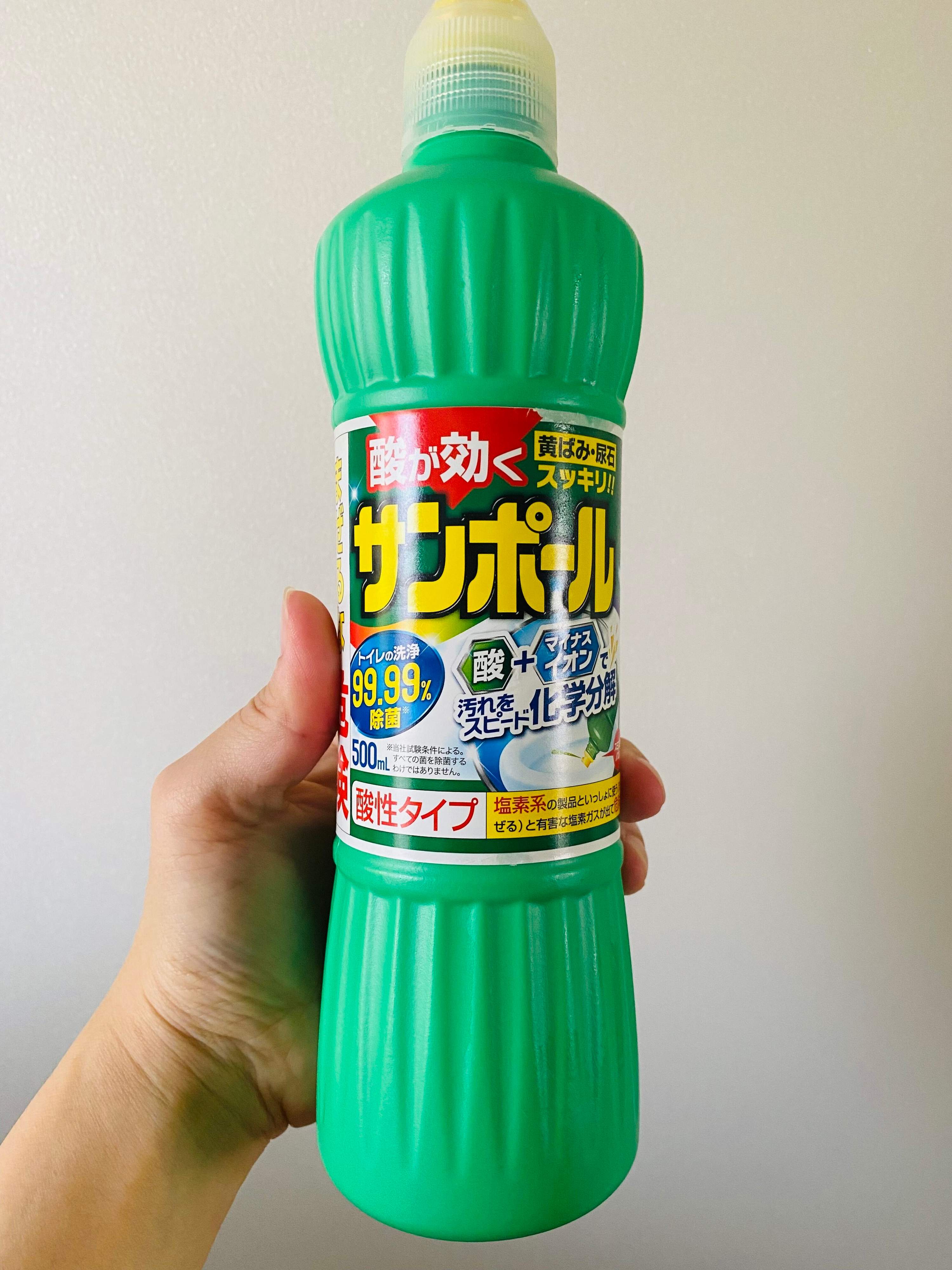 ご存じ、有名な酸性洗剤のサンポール。10年ものの尿石もトイレットペーパーに洗剤を染み込ませパックをして15分ほど待つとスルリと取れてしまうという逸品です。
