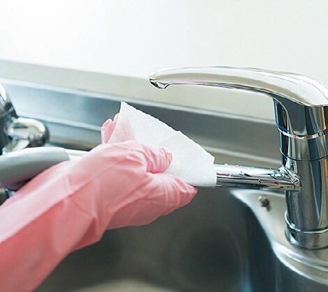 水栓まわりは、ぬらした磨きシートでキュキュッ。そのままだと水跡が残るので、マイクロファイバーでから拭きをして。